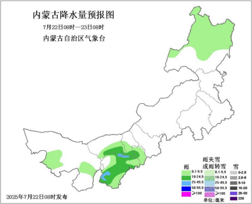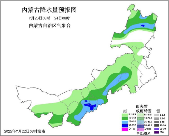 7月22日至23日,我区西部偏南和偏东、中部偏西南和东北部偏北地区多云,有分布不均匀的小雨或雷阵雨。巴彦淖尔市东南部、鄂尔多斯市大部、包头市南部、呼和浩特市西北部有中雨,局部地区大雨,上述部分地区伴有短时强降水、雷暴大风等强对流天气;西部大部、中部偏北地区4、5级短时6级偏南风或西北风;西部偏西和偏北、中部偏北和东北部偏西部分地区有35度及以上高温天气,西部偏西北地区有37度及以上高温天气。