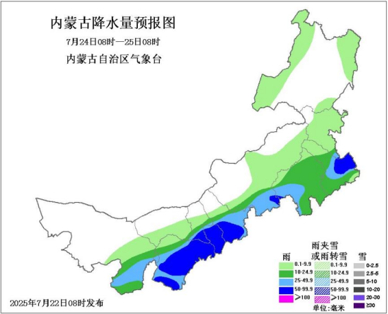 7月24日至25日,我区西部偏南和偏东、中部偏南和偏东、东部大部地区多云,有小雨或雷阵雨。阿拉善盟东南部、巴彦淖尔市东南部、鄂尔多斯市大部、包头市南部、呼和浩特市、乌兰察布市南部、锡林郭勒盟南部、赤峰市大部、通辽市大部有中到大雨,鄂尔多斯市东部和南部、包头市南部偏南、呼和浩特市大部、乌兰察布市西南部、锡林郭勒盟东南部、赤峰市西南部部分地区、通辽市东南部有暴雨,局部地区有大暴雨,上述部分地区伴有短时强降水、雷暴大风、冰雹等强对流天气;东部偏南地区4、5级短时6级西南风;西部偏西和偏北部分地区有35度及以上的高温天气,局地有37度及以上的高温天气。