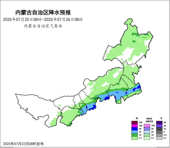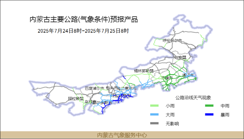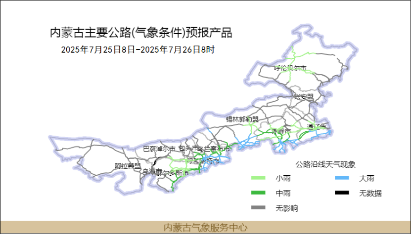 7月25日至26日,西部偏东、中东部大部多云有小雨,鄂尔多斯市东部、呼和浩特市大部、乌兰察布市南部、锡林郭勒盟南部、赤峰市西南部、呼伦贝尔市北部有中到大雨,局地有暴雨;西部偏北地区4、5级偏东风;西部偏西和偏北、中部偏西北、东北部部分地区有35度及以上的高温天气,局地有37度及以上的高温天气。