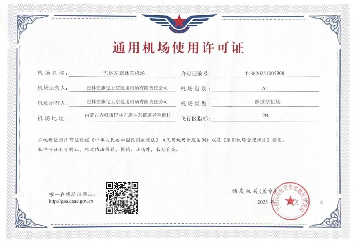 2025年6月30日,巴林左旗林东机场正式获得民航华北地区管理局颁发的通用机场使用许可证,标志着该机场设施及运营管理均满足通航要求,具备了正式投入使用的条件。